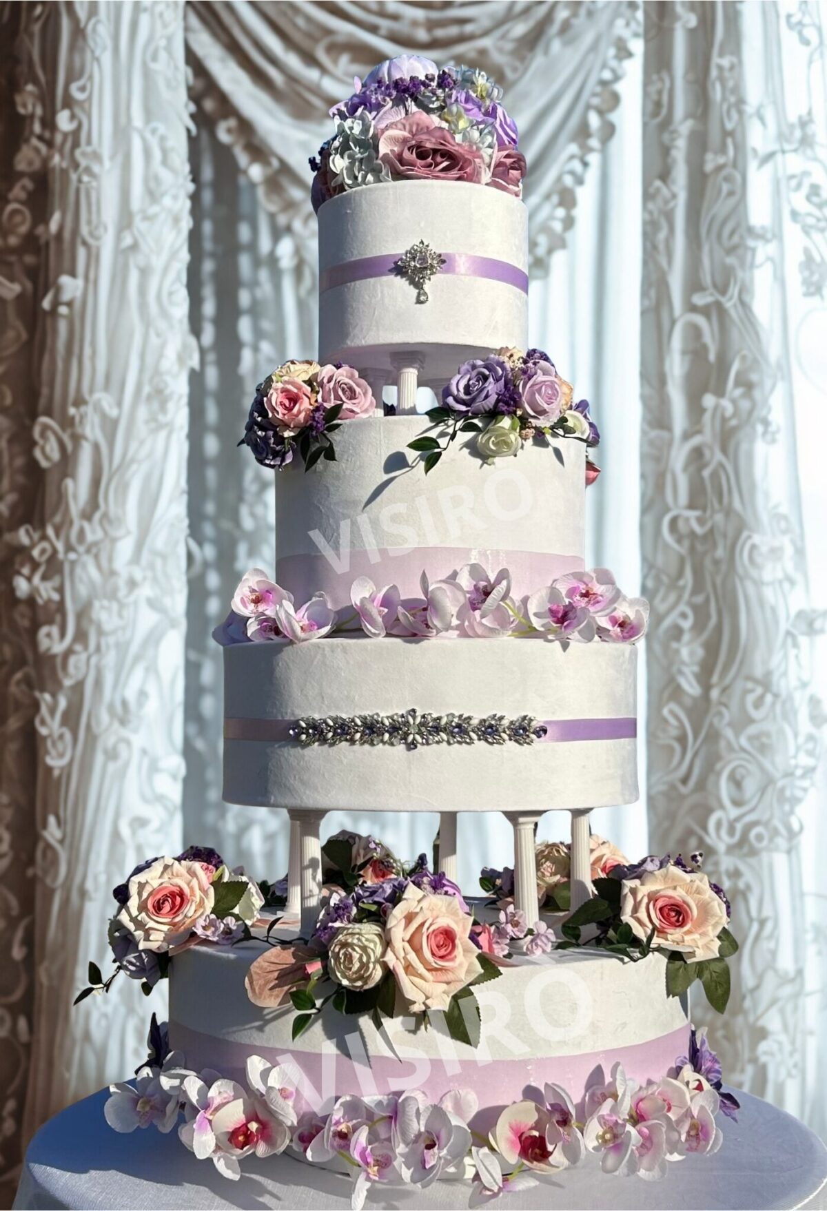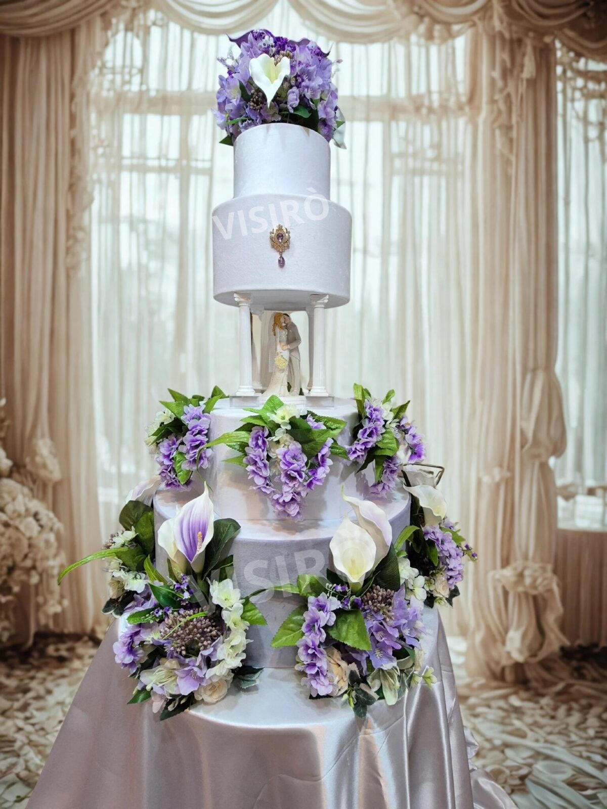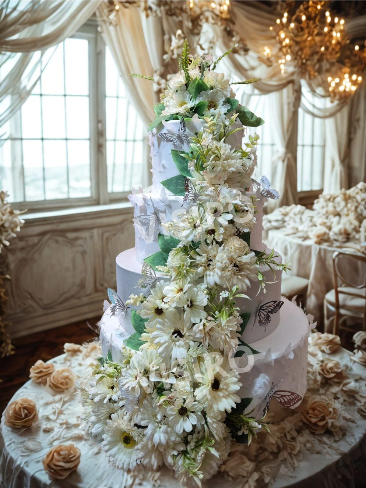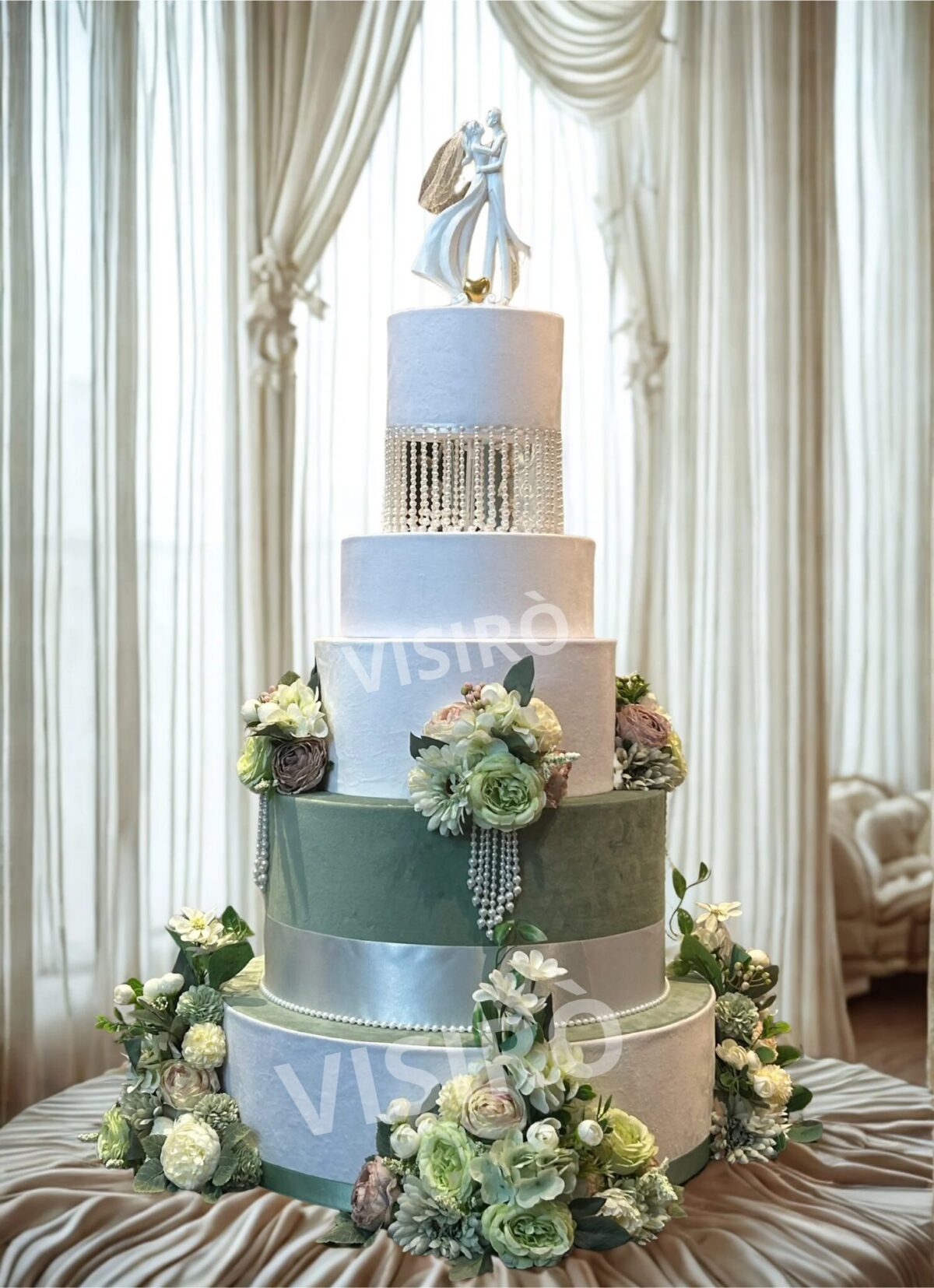 Decorazioni Artigianali Minuziose: ogni torta è impreziosita con fiori artificiali iperrealistici, perle, gioielli, fregi e dettagli in metallo, lavorati singolarmente per creare composizioni armoniose e ricche di significato.